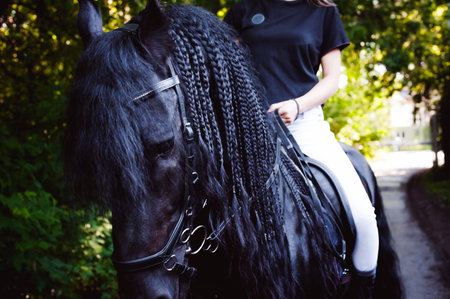 Emotional portrait of a horsewoman rider woman, astride, in love with horses, black Friesian stallion thoroughbred pet, outdoors