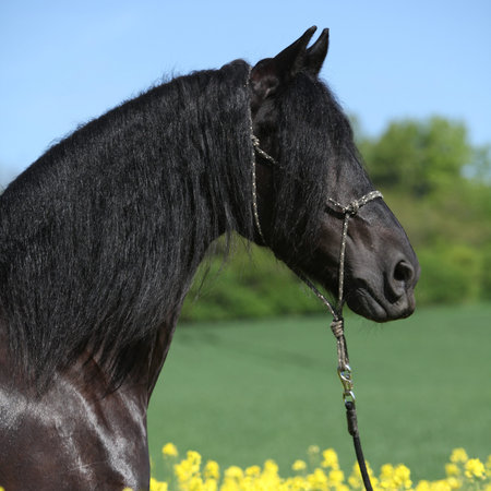Gorgeous black friesian horse standing in colza field