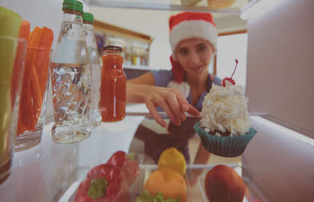 Portrait of female in santa hat standing near open fridge full of healthy food, vegetables and fruits