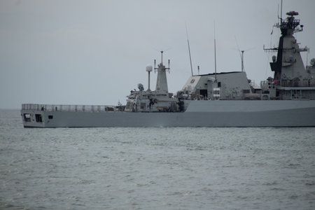 Large grey modern warship sailing. NATO ship sailing at sea. Naval Forces