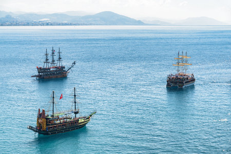 Awesome view of tourist ships and boats in the Mediterranean Sea by the coast of Alanya, Turkey. The ships are decorated as piratical. Alanya is a popular tourist destination in Turkey.