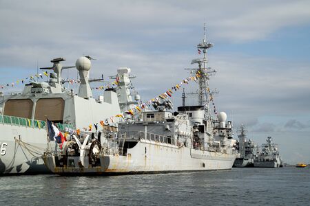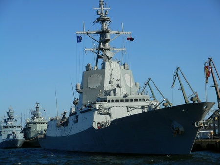 Tallinn, Estonia - October 2, 2005: NATO warships at the pier. Many guns, missile launchers and radars on ships.
