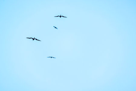 Silhouettes of four frigate birds soaring high against clear blue sky with wings spread wide in graceful flight. Mexico. Cancun.