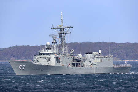 Jervis Bay, Australia - October 1, 2013: HMAS Sydney (FFG 03) Adelaide-class guided-missile frigate of the Royal Australian Navy.
