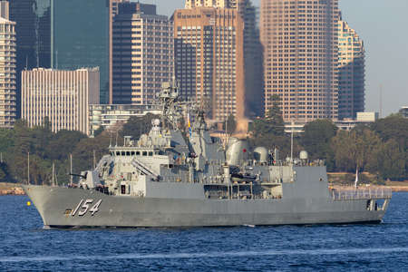 Sydney, Australia - October 5, 2013: HMAS Parramatta (FFH 154) Anzac-class frigate of the Royal Australian Navy in Sydney Harbor.