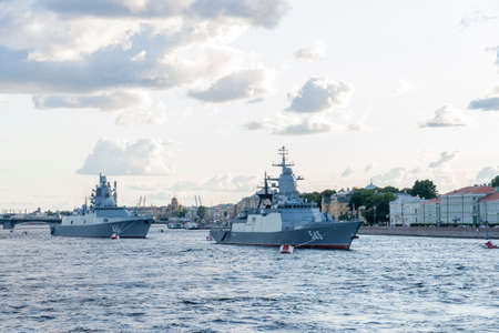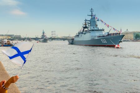 SAINT-PETERSBURG, RUSSIA - JULY 26, 2013: Day of Russian Navy with battle ships parades is on Neva river