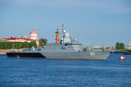 St. Petersburg, Russia -July, 24,2021: Project 21631 Buyan-M small missile ship Grad Sviyazhsk at the Navy Day parade in St. Petersburg.