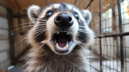 A close up of a fictional sabretooth squirrel with its mouth open, AI
