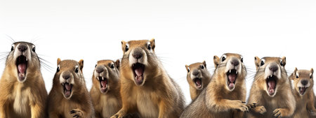 A captivating close-up image of a prairie dog caught mid-yawn, showcasing its detailed fur and expressive features against a lush green background.