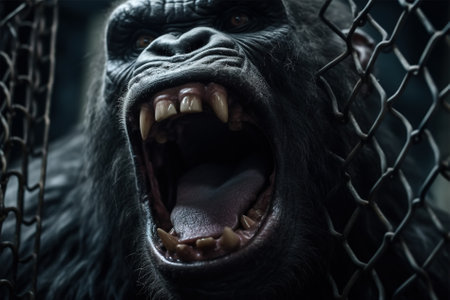 Aggressive screaming gorilla behind bars of cage, big open mouth with fangs angry monkey behind iron mesh. Animal in prison and imprisonment, Generative AI illustration.