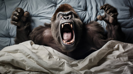 a gorilla with dynamic and exaggerated facial expressions stands on top of a bed in a wild scene. this epic portraiture captures the intense movement expression and playful expressions of the gorilla. the photo showcases the explosive wildlife and creates a captivating documentary-like atmosphere. ai generated