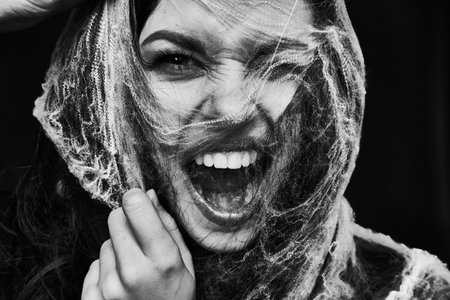 Woman with halloween spiders all over her face. Night of the dead. Copy space. Selective focus.