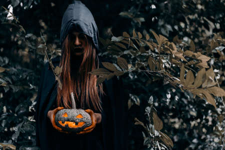 Witch holding pumpkin carved halloween horror concept, psychopomp evil wicked at dark forest with copy space the right.