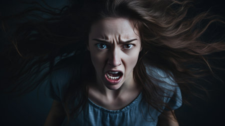 Close up portrait of evil scary girl possessed by a demon with a sinister smile