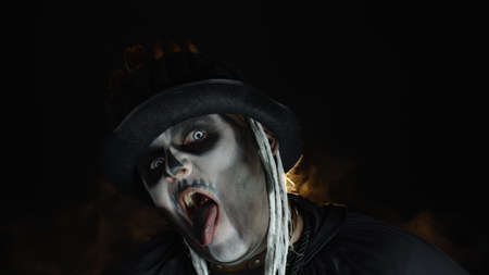 Sinister, crazy man with skeleton makeup in top-hat. Guy making angry faces, shaking head, showing tongue. Voodoo rituals. Baron Saturday. Halloween party. Black background