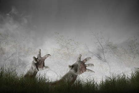 Zombie hand rising out from ground with cross over spooky forest at night time, Horror background, Halloween concept