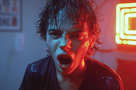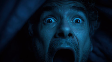 Intense Emotion of Fear Captured in a Close-Up of a Man's Face with Wide Eyes and Open Mouth in a Dark Setting, Evoking Raw Human Experience
