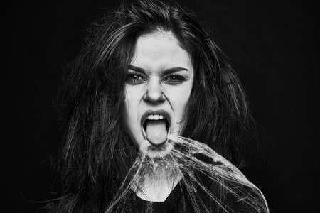 Angry and crazy brunette witch casting a spell and shouting, creepy horror, witchcraft and halloween concept