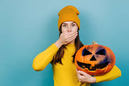 Amazed young woman holding big spooky carved pumpkin covering mouth with hand, looking in shock at camera, dressed in orange sweater and hat, isolated on studio blue background. Happy Halloween!