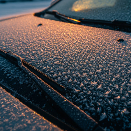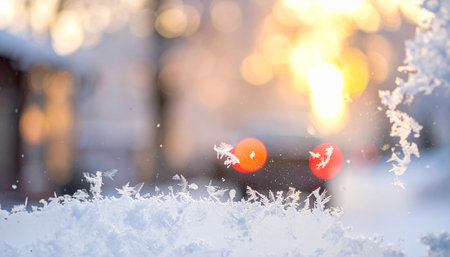 Delicate ice crystals and snow adorn a car window, with blurred red taillights visible in the background.