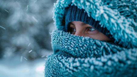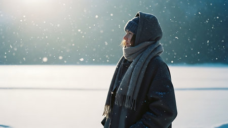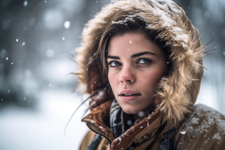 shot of a young woman out in the snow, created with generative ai