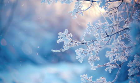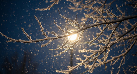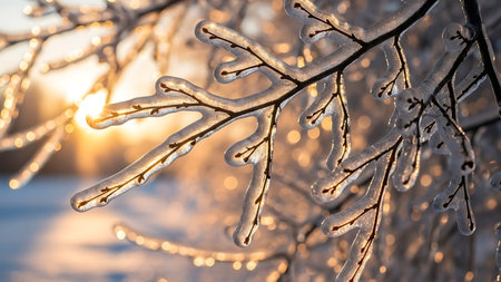 Sunlight illuminates delicate ice covered branches creating a beautiful winter scene with sparkling light and frosty textures