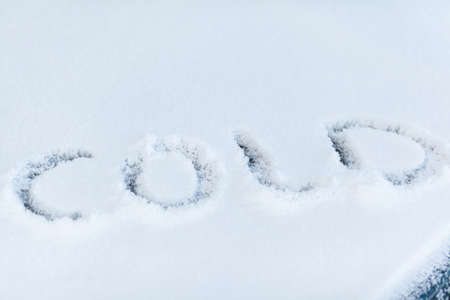 The word cold written on a frozen car screen. Cold written on front windshield of a car. Word cold over car wipers. Cold inscription written on a frosted car windscreen. Snowy background. Meteorology
