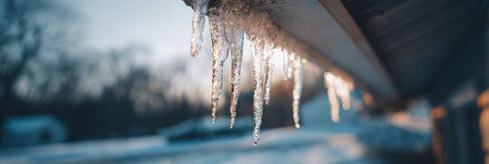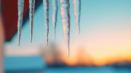 Closeup of icicles hanging from a roof against a blurry sunset sky. High quality photo.