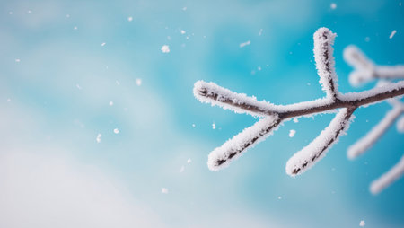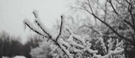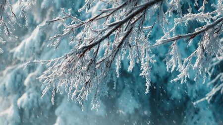 Frosty branches covered in snow create a serene winter landscape