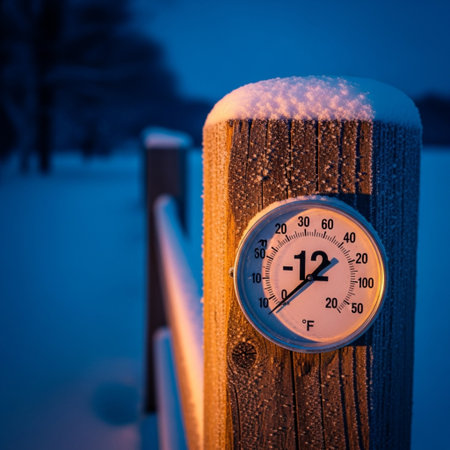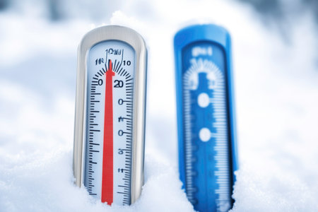 Street thermometer lying on ice in frosty temperature thirty degrees