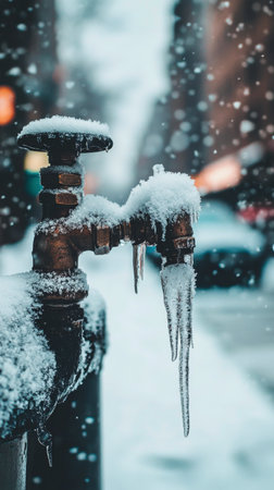 A faucet covered in ice shows large icicles hanging down. Snow blankets the ground, while a residential street with parked cars is visible in the background during winter.