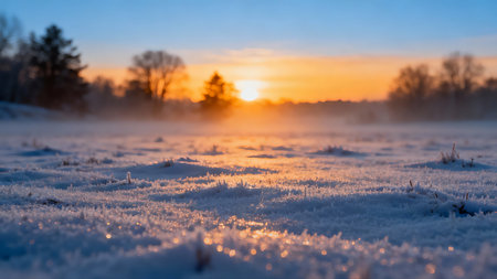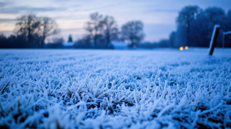 A picturesque winter scene featuring a frosty grass field at dawn. The soft blue hues and gentle light create a serene atmosphere perfect for nature lovers.