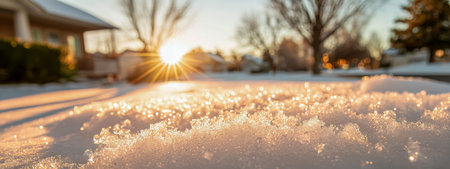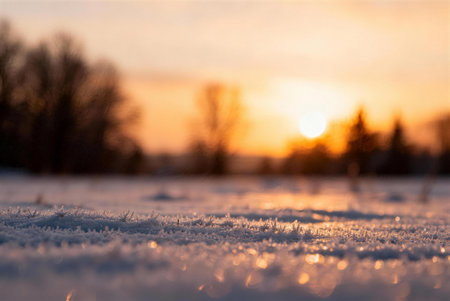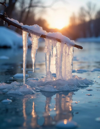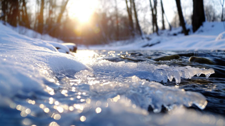 Stunning view of ice crystals along a frozen river, capturing the warm sunlight shimmering on the icy surface during sunset. Perfect winter scenery.