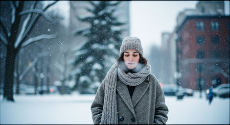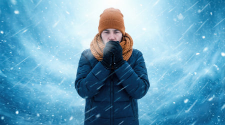 A young man wearing a beanie, scarf, and jacket stands in a blizzard, blowing on his gloved hands to stay warm against the freezing cold and falling snow.