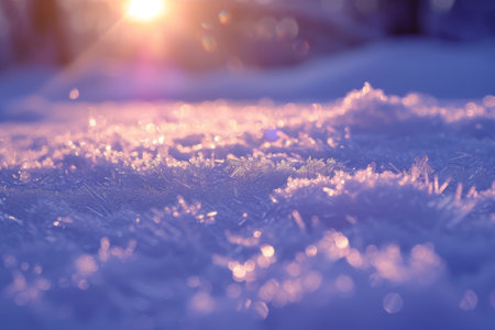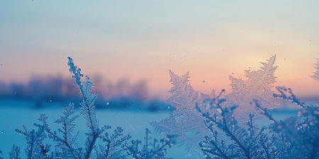 A breathtaking winter scene showcasing intricate frost patterns on ice, illuminated by the soft light of sunrise. The tranquil landscape evokes feelings of serenity.