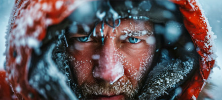 Close-up portrait of a mature man in winter clothes with frost on his ruddy frozen face. A fearless explorer and extreme tourist, he endures severe frost.
