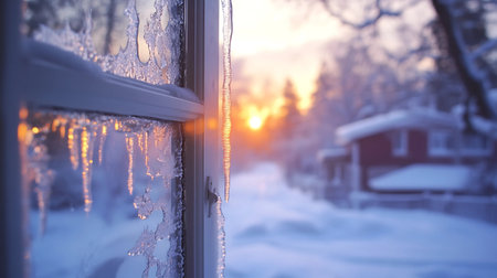 Winter landscape with snow and icicles on the windowsill at sunset