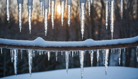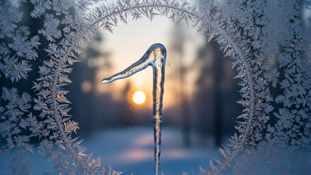 Icicles and ice crystals form in the cold of winter