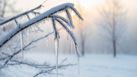 AI Generated. Winter branches covered in frost with glistening icicles and sunlight in the background during a snowy morning