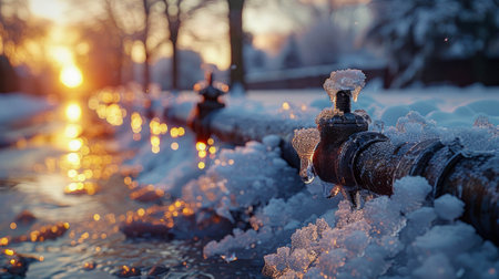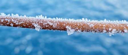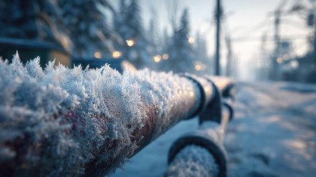 A close-up view of a frosted metal pipe with intricate ice crystals glistening in the soft morning light against a snowy winter landscape.