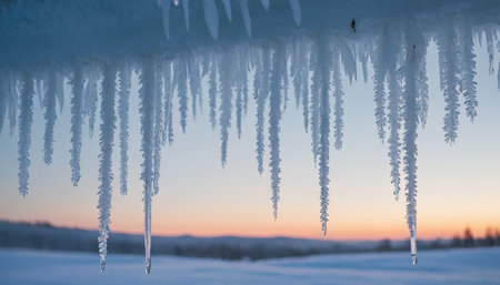 Delicate icicles hang in rows against a soft pastel sunset sky, with a snow-covered landscape in the background.
