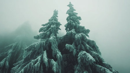 Frosted evergreen trees stand tall in a thick foggy atmosphere.