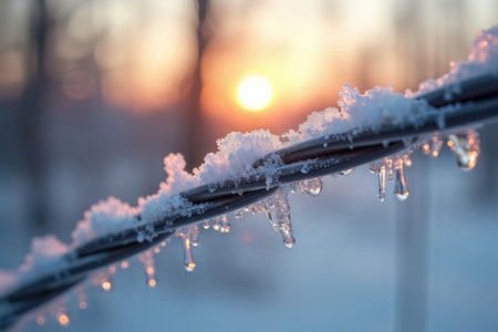 Icy cable at sunset. A macro view of snow and icicles on a power cable with a warm, blurred sunset in the background.