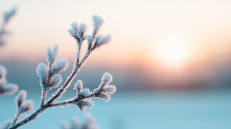 A captivating scene showcasing frost-covered wildflowers against a soft pastel sky at sunset, creating a serene winter landscape filled with beauty.