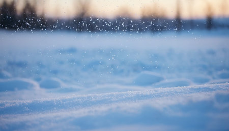 Falling snow creates a soft, blurred effect over a serene, undulating snow-covered landscape with a pale sky.