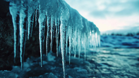 AI Generated. An frozen landscape with icicles hanging from the sky