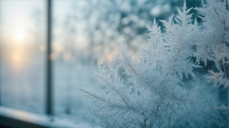Frosted glass reveals a stunning sunrise over a snowy landscape, with condensation creating a cozy atmosphere. Nature's beauty fills the air as morning light breaks through.
