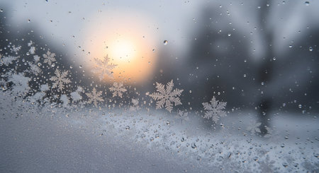 A close-up macro shot of delicate ice crystal snowflakes and water droplets on a frosty window. The rising or setting sun glows in the blurry background, creating a serene winter scene.
