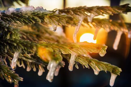 Frost-covered branch against a sunrise sky. High quality photo.