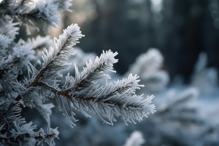 Photography captures snow-laden pine branches with frost, contrasted by a rich green background, evoking a tranquil winter atmosphere with copy space for text